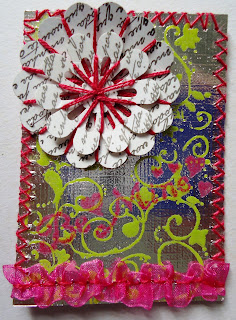 O meu ATC mistura carimbo, emboss, e costura a mão. Fiz o meu carimbando de verde a base prata, o título em pink e fazendo emboss, carimbei de preto as flores feitas com furadores, usei linha pink nas flores, e para costurar as bordas do ATC, finalizei com a fita costurada com linha pink.