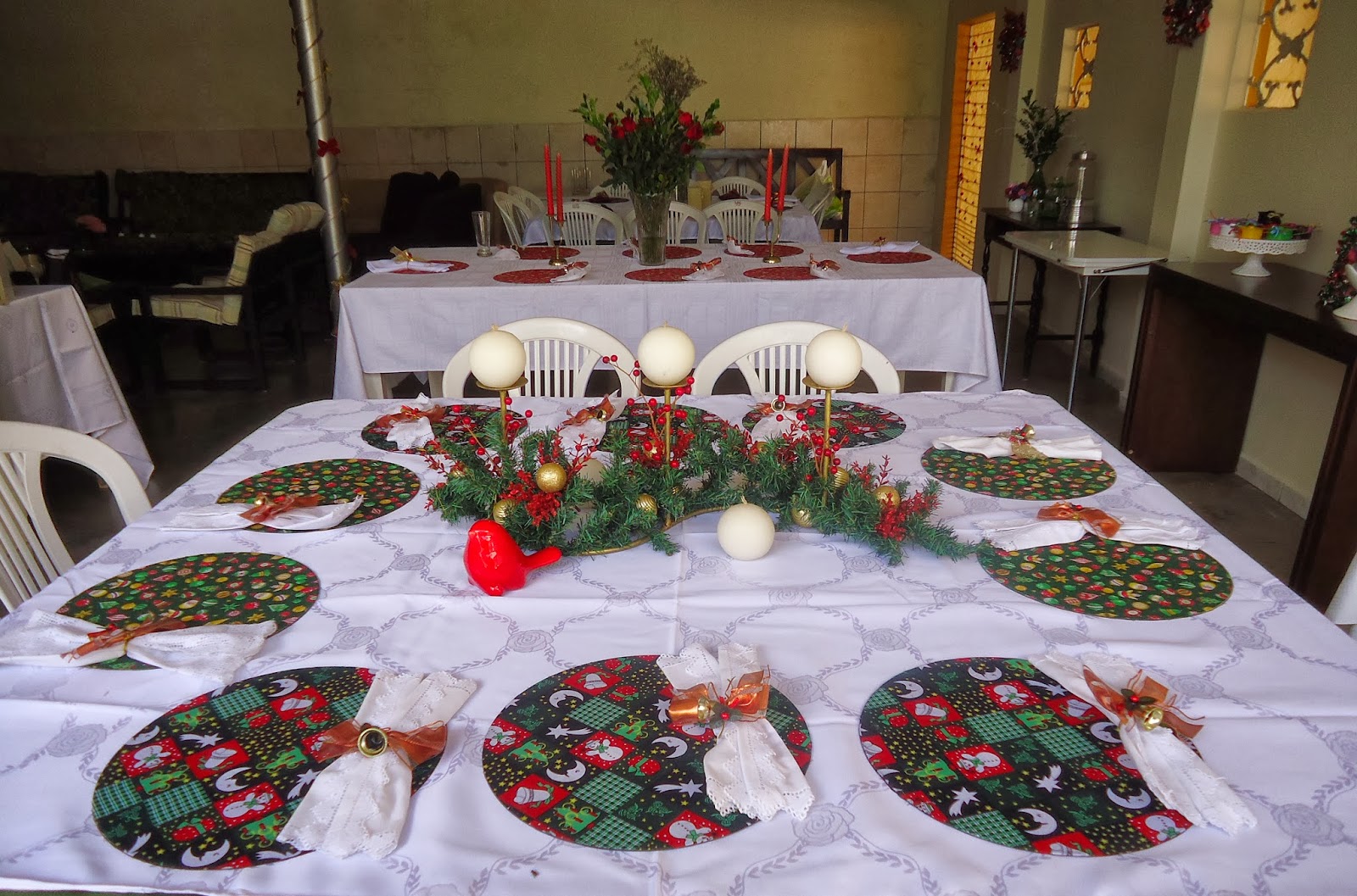 | Aqui a mesa pronta, os porta guardanapos com fitas e adereços natalinos. |